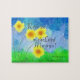 Inspirational quote custom jigsaw puzzle depicts beautiful yellow and orange hand painted sunflowers and features Bible Verse Philippians 4:4, "Rejoice in the Lord Always."~