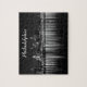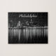 This is the beautiful skyline of the city of Philadelphia, taken at night from across the Delaware River at the Camden waterfront. The architecture of the skyscrapers and buildings of Philly are on display in this black and white photo. Centre City, the downtown area of Philadelphia, is the focus of this photograph. The lights of the city cast reflections on the water.