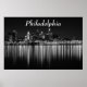 This is the beautiful skyline of the city of Philadelphia, taken at night from across the Delaware River at the Camden waterfront. The architecture of the skyscrapers and buildings of Philly are on display in this black and white photo. Centre City, the downtown area of Philadelphia, is the focus of this photograph. The lights of the city cast reflections on the water.