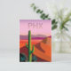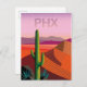 This design is a contemporary poster with a simple graphic expression of desert landscape in warm red, pink and purple with saguaro cactus in foreground. Text abbreviation "PHX" appears at top of poster and "Arizona" in small white type at bottom.