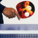 A ping pong paddle with a double sided image of a Phoenix rising from the ashes.