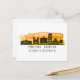 Postcard design features Phoenix, Arizona city skyline silhouette with sunset watercolor splash background and latitude & longitude map coordinates.