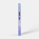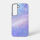 The phone case depicts the image of a pink galaxy, surrounded by shades of blues and purples with stars all around it.