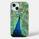 Proud peacock with brilliant blue body displayed against his opened tail feathers of green and blue.