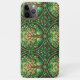 Phone case with an intricate green and brown leaf pattern, featuring circular designs and floral elements. The style is vibrant and nature-inspired.