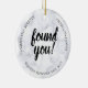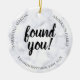 Adoption reunion ornament to commemorate a meeting, reunion or contact. For adoptees who have located, contacted or reunited with biological family members of biological family who want a memento, keepsake or token gift to share with newfound family this ornament declares found you in large black script font with templates that allow you to record the date of reunion or contact and names or other messages. Set on faux white marble.