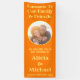 This bright orange banner features a circular photo of the cute happy couple. Fun summer yellow font completes this wedding welcome sign. To edit the text and change the photo click on the personalize button.