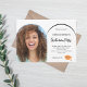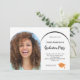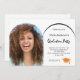 Add your own vertical size photo of the graduate. An arch shaped photo frame. A chic white background colour. Personalize and add a name and party details.