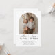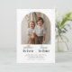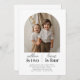 Une invitation conjointe moderne à l'anniversaire avec votre propre photo en forme d'arc avec le nom et l'âge des amis ou des frères et soeurs, avec les détails en dessous.