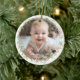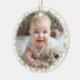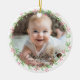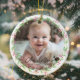 Commemorate your baby's first Christmas with this elegant, customizable round photo ceramic ornament. The design features a charming, minimalist wreath, handwriting font, offering a blend of rustic simplicity and timeless elegance. Upload your favourite photo and personalize the ornament with your baby's name, beautifully showcased in a delicate script font.