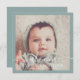 Un format carré unique faire-part de naissance moderne bébé avec une bordure bleu vert et une typographie blanche superposé avec le type dans le rond, et la date de naissance et de naissance de votre bébé avec une photo bébé doux sobre, avec le visage du bébé et le centre encerclé par le type. Au bas de la carte se trouve un script blanc superposé "bienvenue" Ajoutez simplement la photo, le nom et les statistiques de votre bébé.