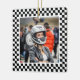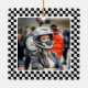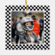 Motorsport themed ornament with a black and white checkered frame. Upload your own photo. Identical image is placed on both sides.