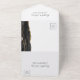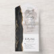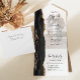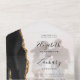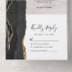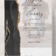 The left-hand edge of this elegant modern all-in-one wedding invitation and RSVP features a black watercolor agate border trimmed with faux gold glitter. The customizable black text overlay combines charcoal grey handwriting, copperplate and italic fonts over a photo of your choice, softened with a white filter to highlight the text. The return address appears on the outside flap and on the reverse side of the detachable RSVP card.