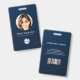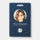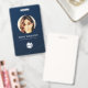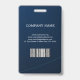 Modern photo business ID identification card with barcode over dark blue background. Additional information can be added to the backside of this business ID badge