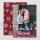 Photo Christmas Pregnancy Announcement Cards. Expecting parents! Modern white hand lettered typography "Extra cheer this year!" script card to share your happy news with family and friends in the holiday season. At the backing red colour background with white snowflakes. You can personalize the design by replacing the sample text and vertical photo. #3343 If You need help or matching items please contact to me!