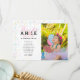 Carte de remerciement de fête d'anniversaire mignonne après une fête d'anniversaire sur le thème du donut avec une illustration de beignet avec des paillettes. Le texte en haut dit "Merci beaucoup" avec un donut à l'intérieur du texte. Personnalisez ce modèle de carte d'invitation en ajoutant le nom de votre enfant en bas et une photo.