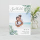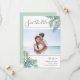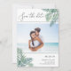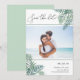 Annoncez votre été, votre destination ou votre mariage sur la plage avec ces chic tropicaux, enregistrez les cartes de dates avec votre photo horizontale ou orientée paysage préférée. Des feuilles de palmiers tropicaux en aquarelle verte apparaissent aux coins, avec "save the date" et vos détails mariages dans un élégant mélange de script et de typographie serif.