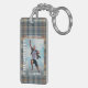 Porte - clé photo diplômé unique et tendance, encadré d'un arrière - plan motif écossais couleur tartan bleu foncé, gris, moutarde jaune brun et blanc couleur plaid. Avec la place de customiser ou de personnaliser avec une photo, le nom du diplômé, et l'année de graduation de la classe.