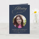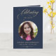 This modern minimalist 4-page funeral memorial order of service program template with elegant gold script on a classic blue background is thoughtfully designed to honor a cherished life with simplicity and grace. Featuring a clean layout with a customizable photo and fully editable text, it provides space for the order of service, obituary, prayers, and meaningful messages.