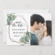 Looking for a unique photo save the date card? Look at this! This product features a single photo with geometric frame in rose gold and eucalyptus frame.