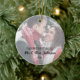 Elegant first christmas ceramic ornament featuring a different photo on either side of the decoration, a white frosty overlay, your names, and the year.
