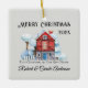 Watercolor illustration of a whimsical red and blue winter house and snow trees with "Merry Christmas" greeting and year, "First Christmas in Our New Home" subtle text and personalized with couple's names, are featured on this cute square ceramic ornament. The background is a platinum color. The design features elegant script, calligraphy and modern typography. Easily change or remove text and add your photo to make it yours using the Template provided. Lightweight and ideal to mail as a thoughtful gift. See "About This Product" information on size and materials.