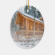 Commemorate your first Christmas in your new home with this beautiful modern keepsake ornament. The charcoal grey text reads "First Christmas in our new home," with the words "new home" in elegant handwriting script with flourishes before and after. Replace the sample image with a photo of your new house and add your family's last name. A white gradient filter helps make the text pop.