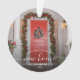 Commemorate your first Christmas in your new home with this beautiful modern keepsake ornament. The white text reads "First Christmas in our new home," with the words "new home" in elegant handwriting script with flourishes before and after. Replace the sample image with a photo of your new house and add your family's last name and the year. A dark gradient filter helps make the text pop.