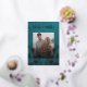 This elegant wedding invitation features a photo and gold foil flowers on a dusty blue floral background. Bride and groom names in an elegant handwritten script.