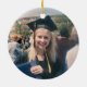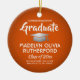 Commemorate the graduate's achievement with a custom photo orange and white round graduation Christmas ornament. Picture and all text are simple to customize. Include school name and degree, congratulations, thanks mom and dad, or other message of your choice. Design features an orange background, a grey faux silver foil graduation cap, personalized modern typography name, school, & class year, and one photo of your choice, such as a senior picture or image from the commencement ceremony. Makes a thoughtful keepsake gift idea and an elegant addition to Xmas home decor. Congratulations to the graduate!