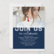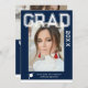 Photo Graduation Party Elegant Modern Script Invitations feature your favourite photo with the simple white text "Grad (year)" and your name and personalized graduation details on the front on a blue background. On the reverse add an additional picture with your graduation invitation information below. Personalize by editing the text in the text boxes provided. Created by ©Evco Studio www.zazzle.com/store/evcostudio