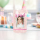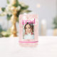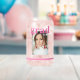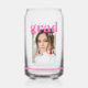 Photo Graduation Party Élégant Script moderne Can Glass Beer Tumbler présente votre photo préférée avec le texte rose simple "Grad (année)" et votre nom et les détails de graduation personnalisés sur le devant. Idéal pour les grands comme cadeau de remise de diplômes ou décoration de fête de remise de diplômes. Créé par ©Evco Studio www.zazzle.com/store/evcostudio