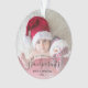 Help them celebrate their first grandchild with this beautiful modern keepsake ornament. The off-black text reads "Our first Christmas as grandparents," with the word "grandparents" in elegant handwriting script with flourishes before and after. Easily replace the sample image with your favourite photo of the new baby, and add his or her name and the year. A white gradient filter helps make the text pop.