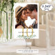 Symbole du numéro de table de mariage botanique moderne avec une ou deux photos du couple (photos fiançailles ou photos datant au fil des ans) pour divertir les invités mariages ainsi que des tables d'identification. Dupliqué sur les deux côtés pour un affichage à deux côtés. CHANGEMENTS : Les couleurs de texte doré et noir peuvent être changées pour correspondre à votre thème de couleur et la verdure peut être supprimée si vous ne le souhaitez pas. ASSISTANCE : Pour obtenir de l'aide sur la modification ou la personnalisation de la conception, le changement de couleur, le redimensionnement, le transfert de la conception à un autre produit ou pour coordonner des éléments, contactez le concepteur AVANT DE COMMANDER via Zazzle Conversation ou makeitaboutyoustore@gmail.com.