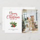 Custom photo Merry Christmas card featuring an elegant script font and holly with berries on the front and snowflakes at the back. Easily personalize this modern holiday card with your photo and text.