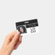 This custom identification badge features a black and white design with a sample photograph to the left of the name and job title. A sample company or business logo is placed in the bottom right, which you can replace with your own custom logo or other image. The back of the photo ID badge contains contact details and additional information.