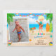 Cute invitation Hawaiian style for girl's birthday featuring blonde boy with guitar, surfs, tropical beach and blue ocean, aloha sign, and some tropical party equipment.