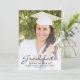 Faire-part moderne de graduation avec une photo verticale personnalisée. Le mot "Graduate" apparaît dans l'écriture bleu marine, avec le nom du diplômé, l'école et l'année de graduation ci-dessous dans la police sans serif. Remplacez facilement l'image de l'échantillon par la photo de votre diplômé. Un écran de dégradé blanc permet de s'assurer que le texte s'affiche. Ajoutez des détails sur les réalisations de votre diplômé et les plans futurs au verso en blanc sur un arrière - plan bleu marine solide. Idéal pour obtenir un diplôme d'études secondaires ou collégiales.