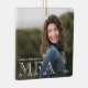 A keepsake photo ornament for an MFA graduate with words in white. It shows the degree, name, and year. The photo is square (other photo shapes may need adjusting). Customize this ornament, add it to your cart, and celebrate this major achievement for years to come.