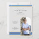 A simple modern Bar Mitzvah invitation featuring your favourite photo designed with a nice arch shape at the top, with blue and gold lines at the bottom and top, on a grey background.