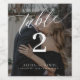 Elegant bold typography script simple modern black and white text dark overlay bride and groom names and photo personalized wedding table number wine labels. +++++++++ Please note that there are 6 labels in one set and to order different numbers you need to customize multiple sets and put them in the shopping cart one by one (one set with no 1, another with no 2, etc).