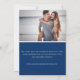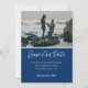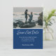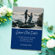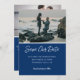 A Wedding Save the Date photo card with a navy blue background and white lettering. Add your photos, your names, wedding date and city/state. All fields can be personalized to make it your own. There is space on the front and back for two separate photos. You can add more information on the back with your wedding website.