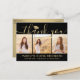 Envoyez une note de gratitude élégante avec personnalisation 3 photo collage noir et or graduation merci cartes postales. Toutes les images et le libellé sont simples à personnaliser. (CONSEIL EN MATIÈRE DE PLACEMENT D'IMAGE : Une façon simple de centrer une photo exactement comment vous voulez est de la rogner avant de la télécharger sur le site Zazzle.) Ce modèle peut être customisé avec n'importe quel libellé de votre choix comme les plans d'études futurs, le nouveau poste ou la citation inspirante préférée. Si vous préférez écrire votre message à la main, supprimez simplement le texte de l'exemple ou utilisez l'espace supplémentaire au-dessus de la nouvelle adresse et des informations de contact. Le design comprend un casquette de planche de mortier à faux papier, une calligraphie manuscrite, une typographie minimaliste moderne et trois photos de votre choix, telles que des images de haut niveau ou des images de la cérémonie de début. Veuillez noter que l'or est imprimé en couleur et non en métal. Ces élégantes cartes personnalisées sont une façon tendance et chic de remercier la famille et les amis pour partager votre célébration de remise des diplômes. Félicitations au diplômé !