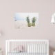 A poster with a photograph featuring a pair of pineapples sitting on a sandy beach.