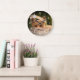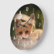 A clock with a darling photograph featuring a little orange fox peering at you from behind a log out in the wilderness.