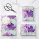 Wrapping paper sheets with a lovely photograph of a dark purple crocus set inside a glass jar. A light purple blossom is present in the background.