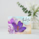 Thank you postcard with a lovely photograph of a dark purple crocus set inside a glass jar. A light purple blossom in present in the background.