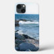This phone case features a beautiful photo of the Atlantic Ocean with waves crashing against a rocky shore.