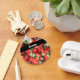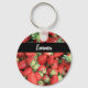 A key chain with a colourful photograph featuring a bunch of luscious red strawberries.
