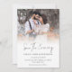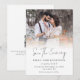 Modern Photo Overlay QR Code Script Wedding Save the Evening. With a QR code to your wedding website on the back so your guests can easily visit your wedding website. Your QR code will be automatically generated to update the sample code in the design, when you simply change the sample URL in the template with your own wedding website URL. Save The Evening is in a stylish set script. Replace the sample photo with your own favourite and personalise the rest of the text.
